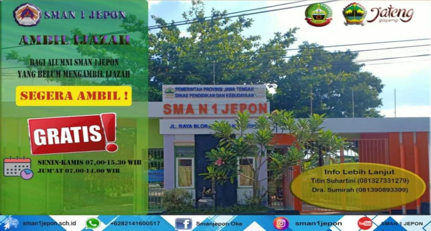 Pengumuman ditujukan untuk segenap alumni SMA N 1 Jepon yang belum mengambil ijasah dan raport, diharap untuk segera mengambil ijasah.